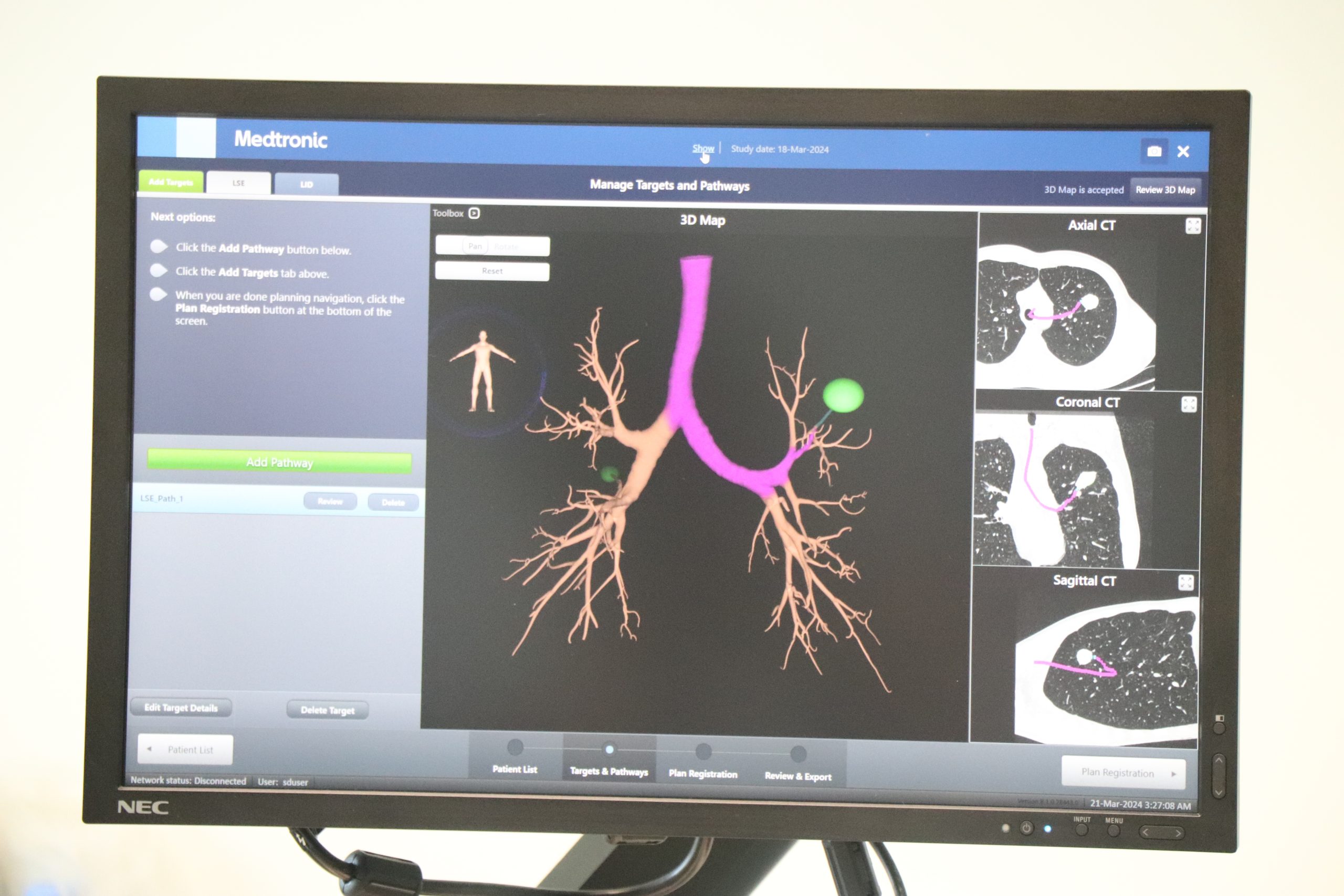 Este exame é efetuado sob anestesia geral e, com a introdução de uma sonda pela boca do doente, os médicos conseguem aceder a zonas onde era muito difícil, ou mesmo impossível, chegar de uma forma não invasiva. Isto porque antes do procedimento, é realizada uma tomografia computadorizada (TC), cuja informação é depois cruzada com a da broncoscopia permitindo chegar aos nódulos a serem examinados por navegação utilizando uma tecnologia semelhante a um GPS dos automóveis.