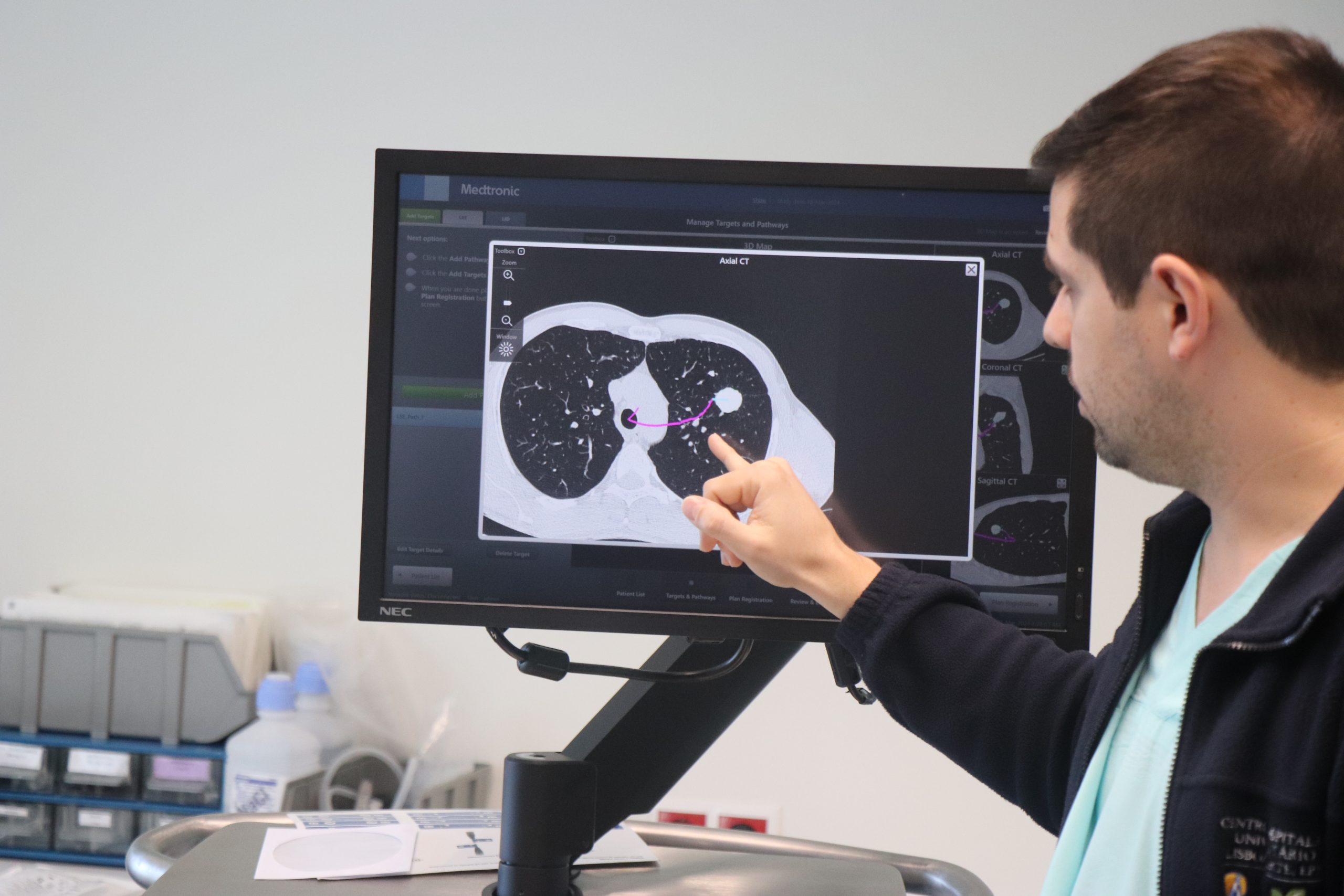 O Serviço de Pneumologia da Unidade Local de Saúde de Santa Maria utilizou recentemente pela primeira vez no Hospital de Santa Maria a nova geração da técnica de navegação eletromagnética broncoscópica. Este procedimento inovador permite diagnosticar pequenas lesões na periferia do pulmão sem recurso a cirurgia, como acontecia habitualmente até agora.