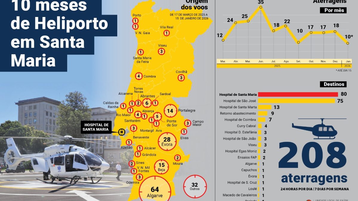 O Heliporto do Hospital de Santa Maria tornou-se, em apenas 10 meses, no ponto estratégico do transporte aéreo de emergência na região de Lisboa. Os registos de movimentos mostram que o Heliporto de Santa Maria já registou mais de 200 (208) aterragens desde que retomou a atividade, em meados de Março de 2025, dando resposta a pedidos de norte a sul do país. Dados que colocam a estrutura da ULS de Santa Maria como a mais utilizada entre as unidades hospitalares nacionais.