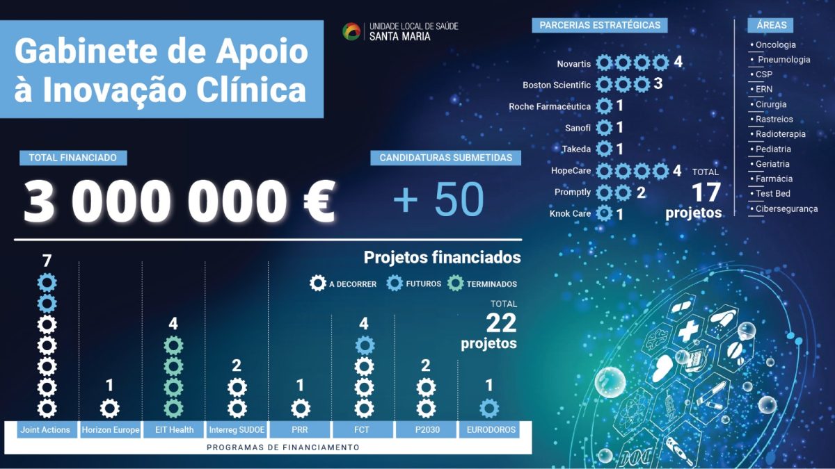 A Unidade Local de Saúde Santa Maria (ULSSM) já assegurou cerca de 3 milhões de euros em financiamento para projetos recentes na área da Inovação. Com mais de 50 candidaturas submetidas, a ULSSM conta atualmente com um portfólio total de 22 projetos financiados.