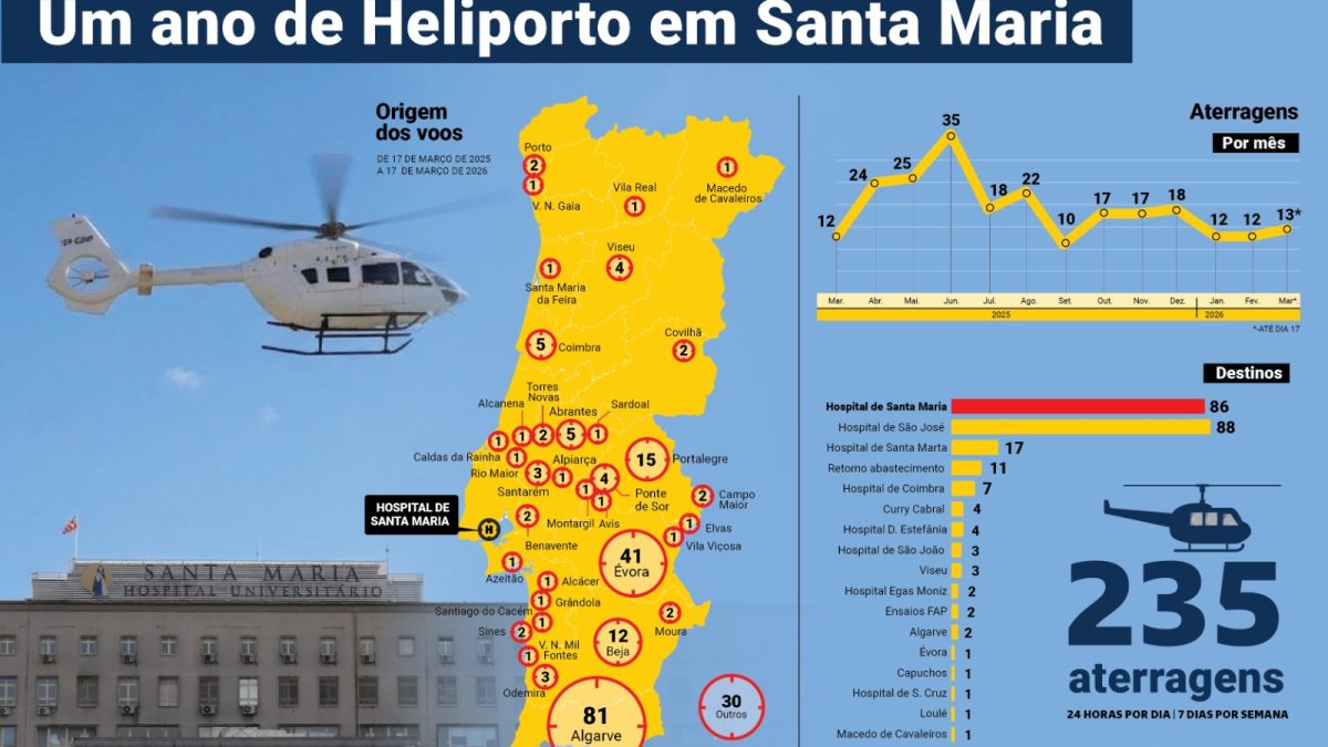 Há exatamente um ano, a 17 de março de 2025, o heliporto do Hospital de Santa Maria registava a sua primeira aterragem após um rigoroso processo de requalificação. Hoje, celebramos a atividade desta infraestrutura estratégica que já recebeu 235 aterragens, reforçando a capacidade de resposta do SNS na área da emergência pré-hospitalar.